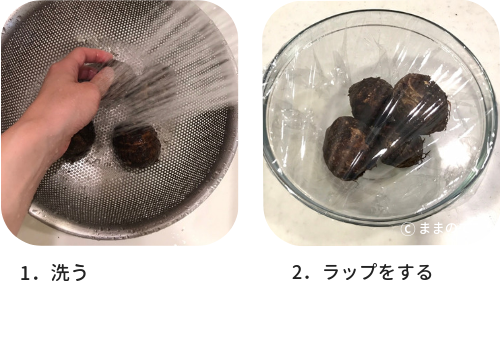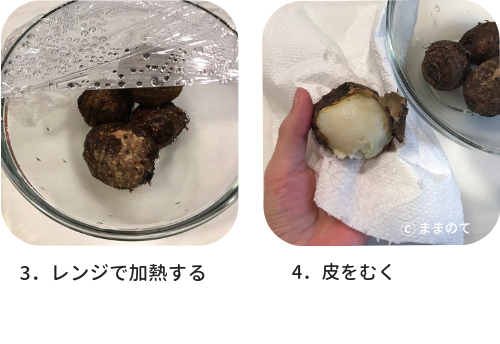 3.レンジで3〜5分加熱する(里芋の種類、W数によって加熱時間を調節してください)。