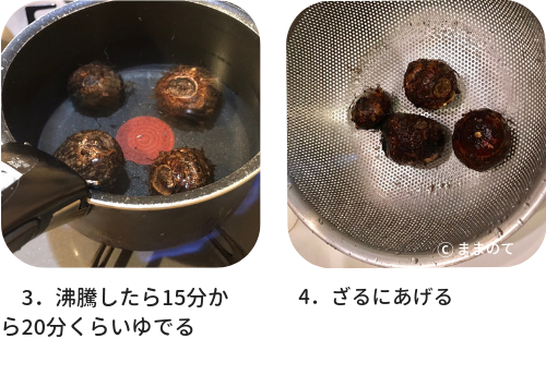 3.1、2の具材をだし汁でやわらかくなるまで煮る。