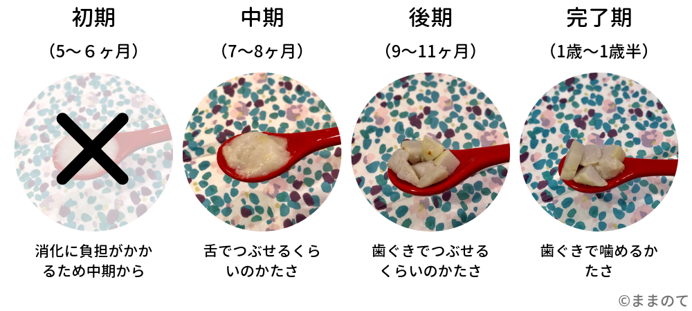 | 中期 (7・8ヶ月頃) ◯ | 舌でつぶせるくらいのかたさ。すりつぶしたペースト状から始め、慣れてきたら2~3mm程度のみじん切りにする。 |