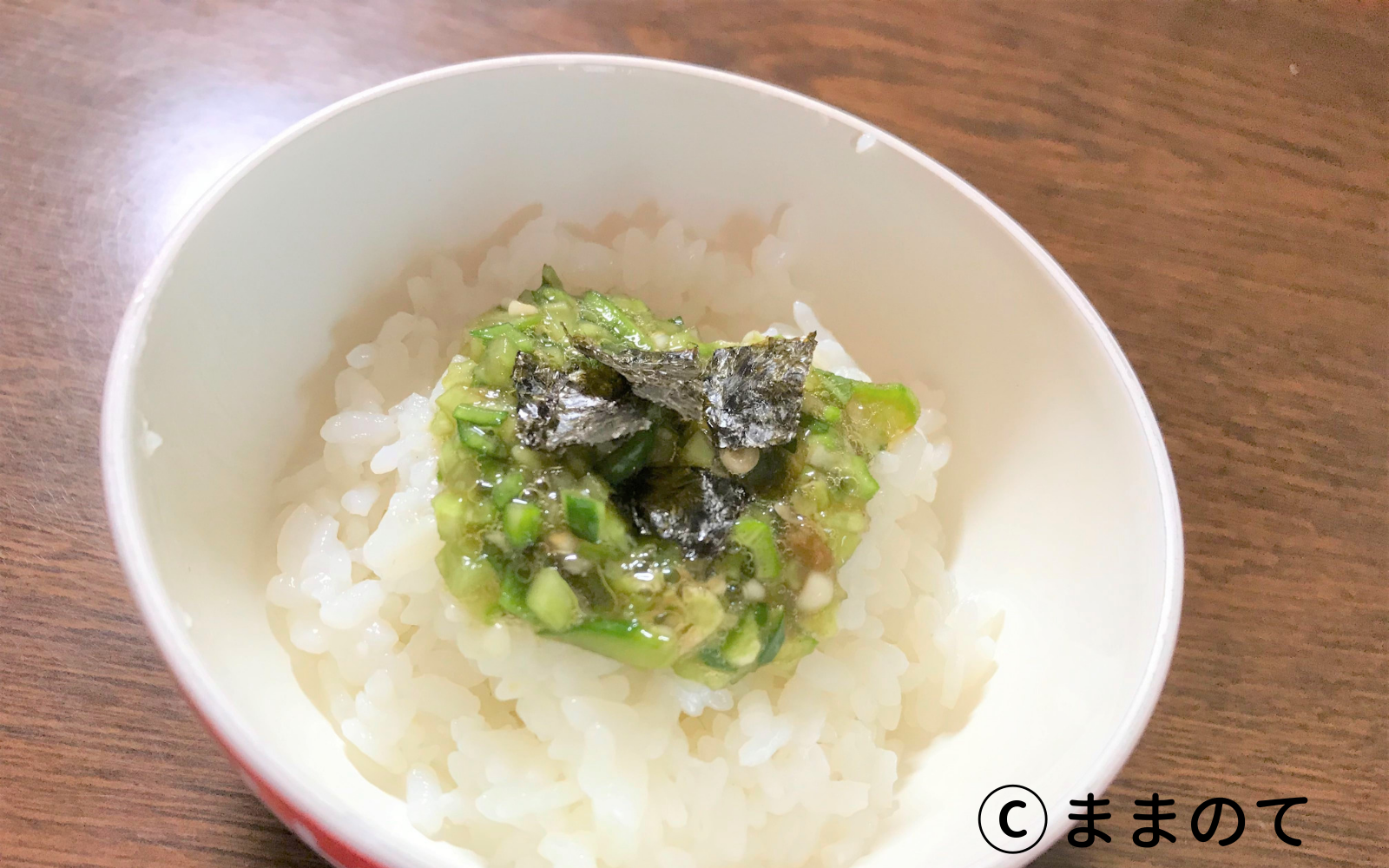 3.きゅうりとオクラにだし汁、細かく砕いたかつおぶし、しょうゆを加えてよく混ぜる