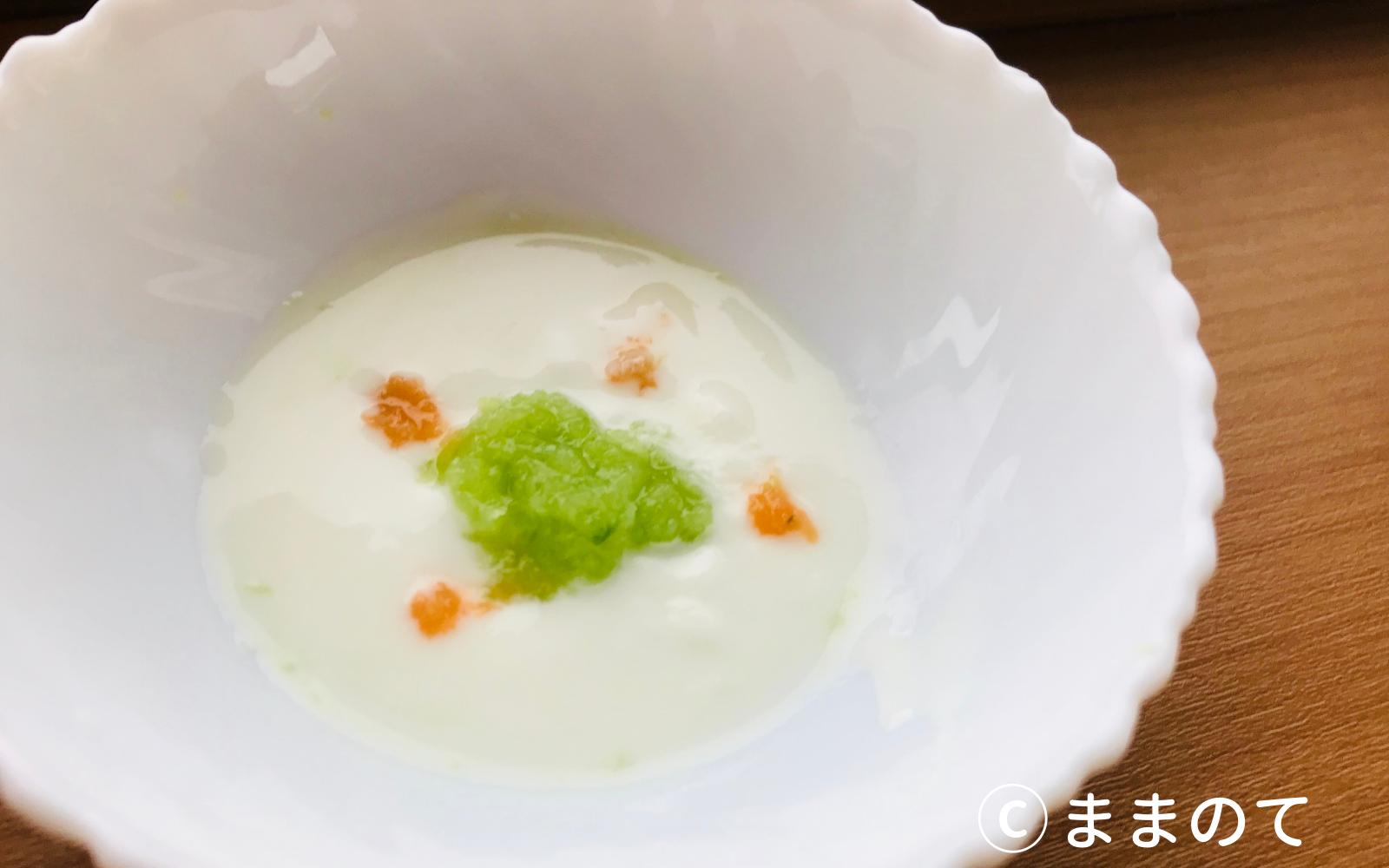 1.赤ちゃん用ヨーグルトにきゅうりペースト・にんじんペーストを盛り付ける