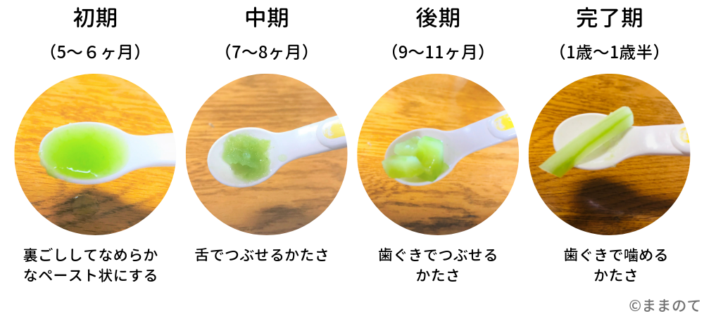 | 完了期(1歳〜1歳半頃) ◯ | 歯茎でかめるかたさ。小さな角切りかスティック。 |