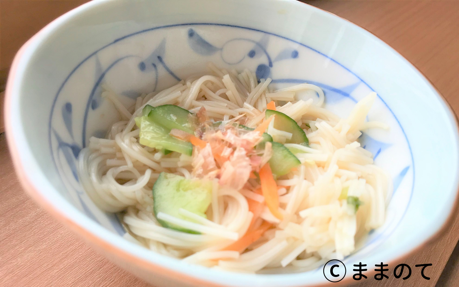 4.そうめんつゆの入った器にそうめん、人参、きゅうりを加える