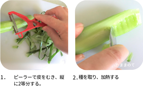 1.皮をむいたきゅうりの種を取り、あらくみじん切りにする