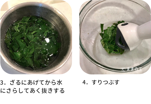 4.細かく刻んでこし器やブレンダーでなめらかになるまですり潰す。水を加えながらちょうど良い形状になったら完成。