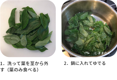 下ごしらえの流れは以下の通りです。モロヘイヤにはほうれん草のようにシュウ酸が含まれているため、クタクタになるまで茹でましょう。茹で時間は目安で3~4分とされていますが、お鍋の大きさやモロヘイヤの量により変わるので調整してくださいね。