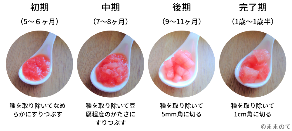 離乳食中期(モグモグ期)になり、赤ちゃんが離乳食を飲み込むことに慣れてきたら、ペーストに少し粒を残して舌触りの違いを楽しませてあげてはいかがでしょうか。上手に口を動かしてモグモグできるようになったら、スイカを細かいみじん切りにして与えても良いですね。