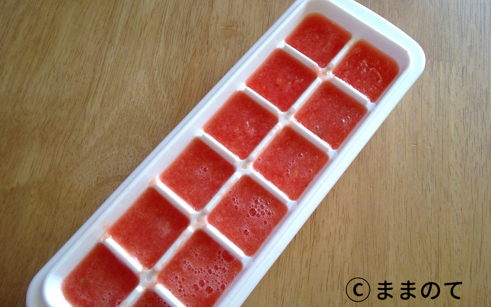 ペースト状にしたスイカは、製氷皿で小分けにして冷凍しておくと1回分ずつ解凍しやすいでしょう。スイカペーストをめいっぱい入れてしまうと製氷皿から取り出しにくくなるため、少なめに入れて冷凍してくださいね。