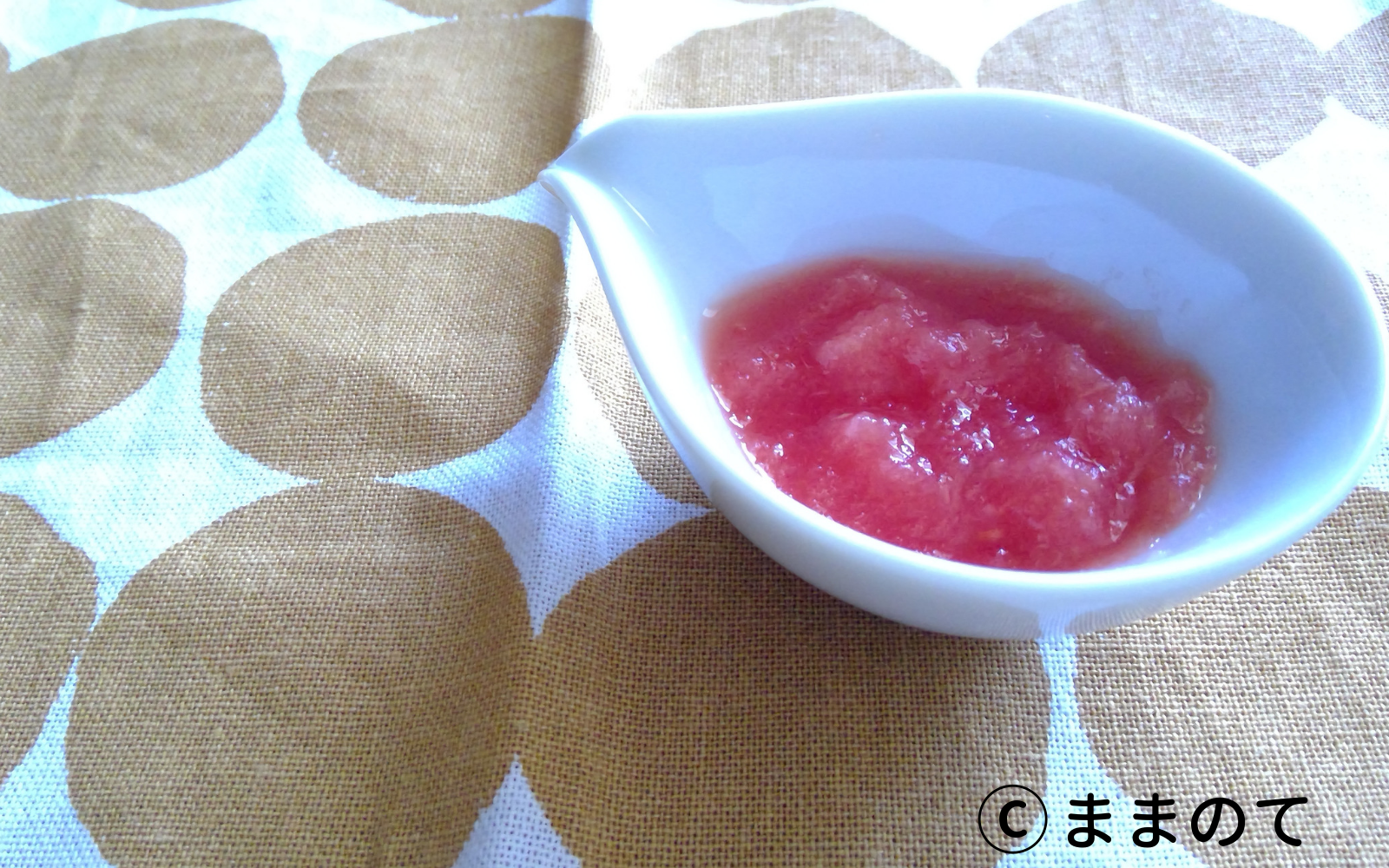 スイカの甘みとトマトの酸味が絶妙なスープは、大人が飲んでもおいしいです。大人用は加熱せず、冷蔵庫で冷やしていただいてはいかがでしょうか。塩を少々加えると、より甘さが際立ちます。赤ちゃんの離乳食の進み具合により、水切りヨーグルトやミントを乗せてもおいしいですよ。