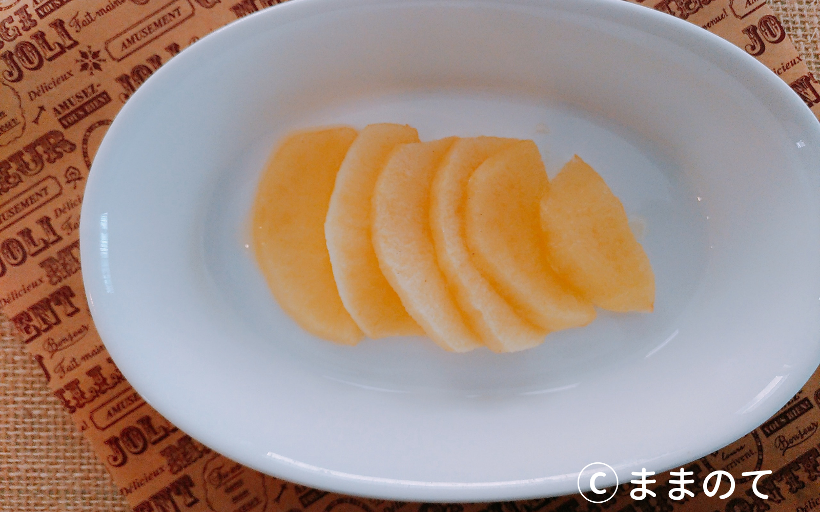 モグモグ期の中期(7・8ヶ月)までは加熱したものを与えるとより安心です。りんごを加熱することには、酸味を和らげ、変色を防ぐというメリットもありますよ。