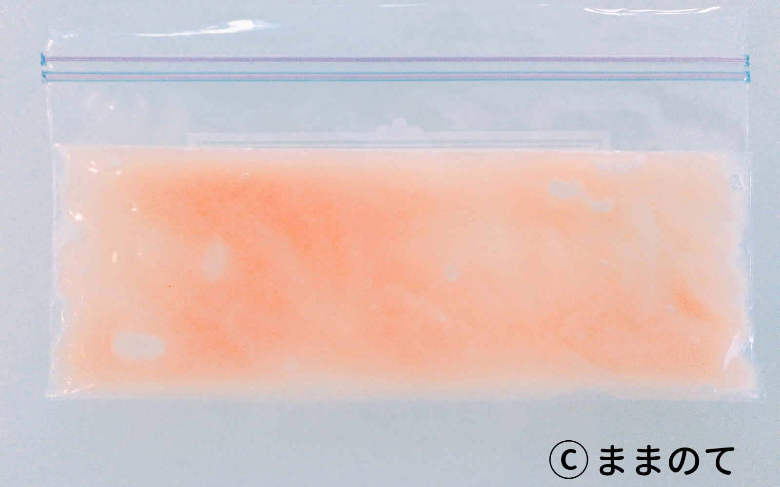 なめらかなペーストにしたりんごは、フリーザーバッグに入れて冷凍しましょう。薄く広げて冷凍すれば使いたい分だけを手で簡単に折ることができます。