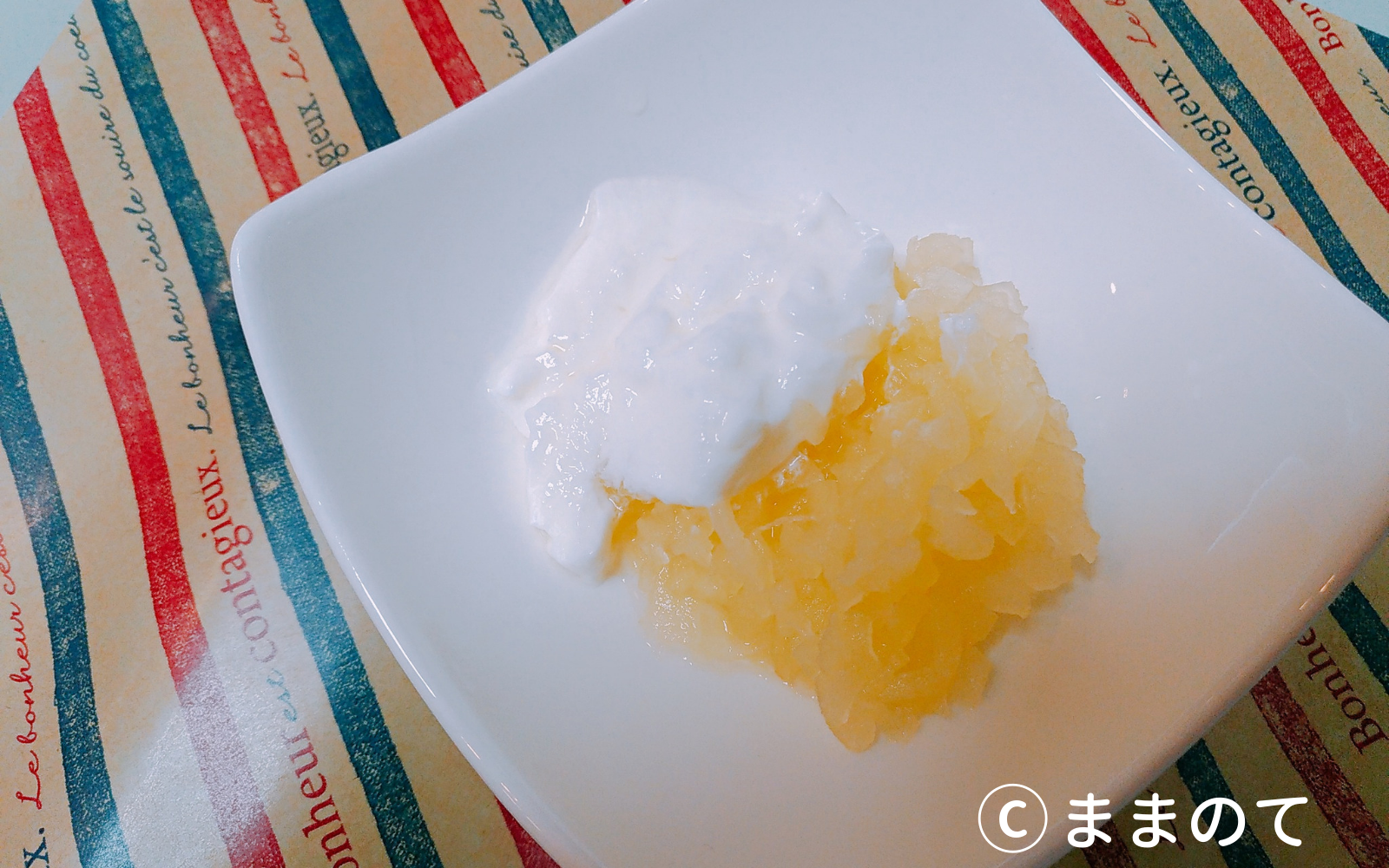 1.皮と芯を取り除いたりんごをすりおろし、プレーンヨーグルトと混ぜる