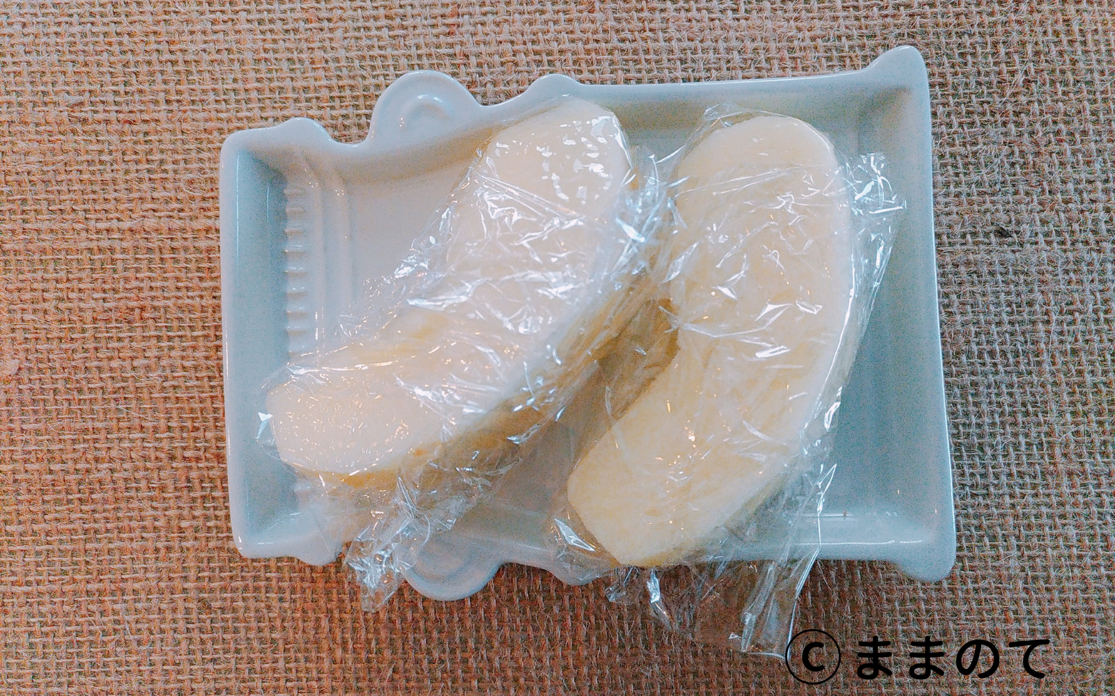 くし切りなどにしたりんごをやわらかくゆで、そのまま冷凍してもOKです。使いたいときに凍ったまますりおろして使えますよ。冷凍するときは、空気に触れないようにひとつずつラップに包みましょう。