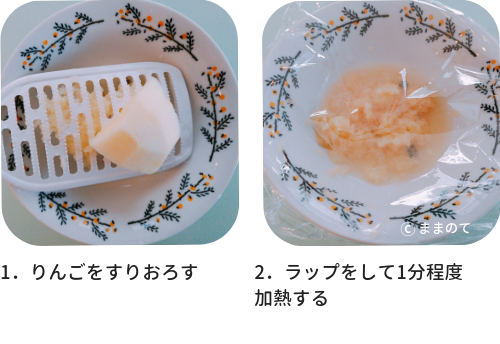 2.耐熱容器にすりおろしたりんごを入れて、ふんわりとラップをかける。600Wの電子レンジで1分ほど加熱したら完成
