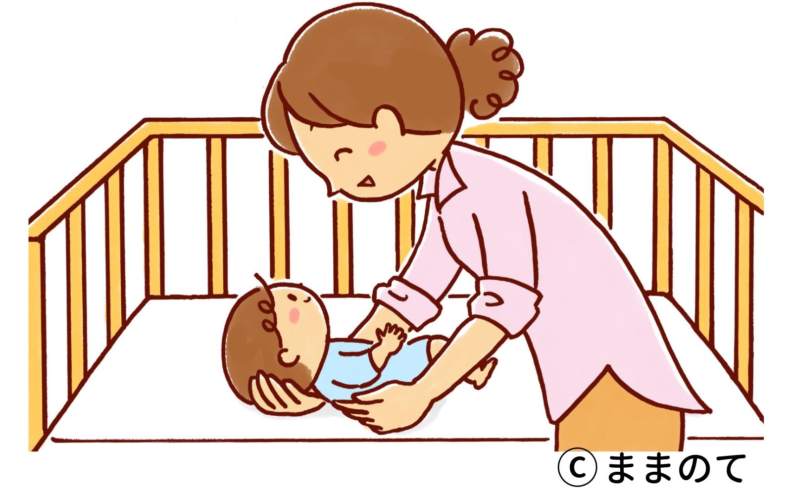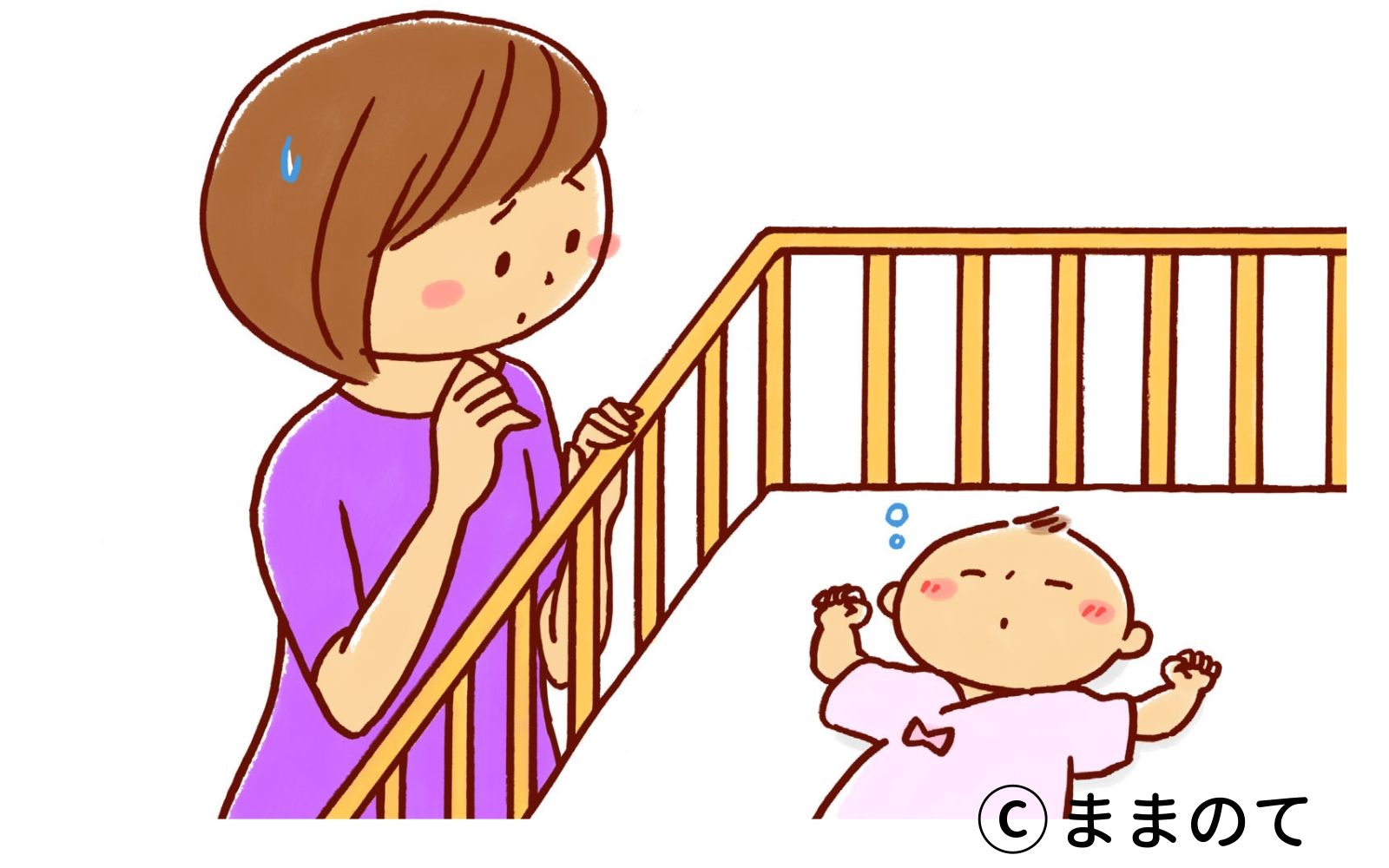 添い寝を避け、赤ちゃんは親と同じ部屋のベビーベッドに寝かせることをおすすめします。同じ部屋に寝ていれば、たとえば赤ちゃんがベッド柵に足をとられるなどしんどそうな場合に早く気づいてあげることができます。布団に寝かせる場合も、できるだけ同じ布団で添い寝をするのは避け、赤ちゃんの布団はわけたほうが良いでしょう。