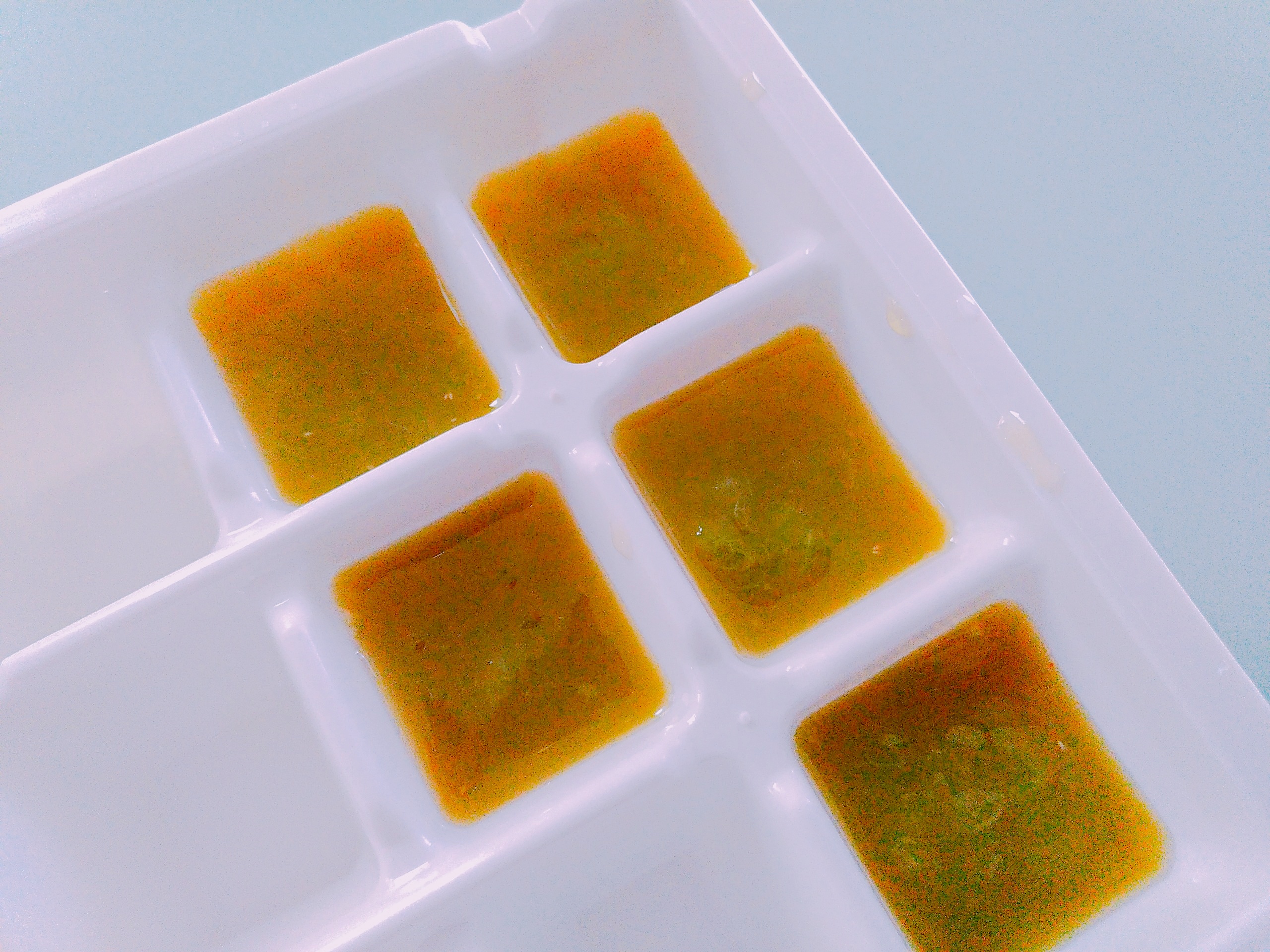 月齢が低い赤ちゃん用には、ピューレにしたものを製氷皿に小分けして冷凍するのがおすすめです。冷凍庫の中で霜やほこりが付かないよう、蓋付きの製氷皿を使うと良いでしょう。