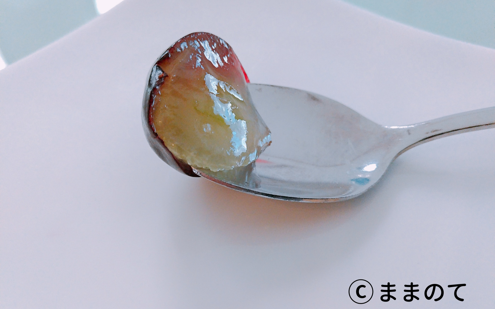 半分に切ったぶどうの実の部分を小さなスプーンでくりぬきます。この際も、おしりのほうからスプーンを入れるとよいでしょう。