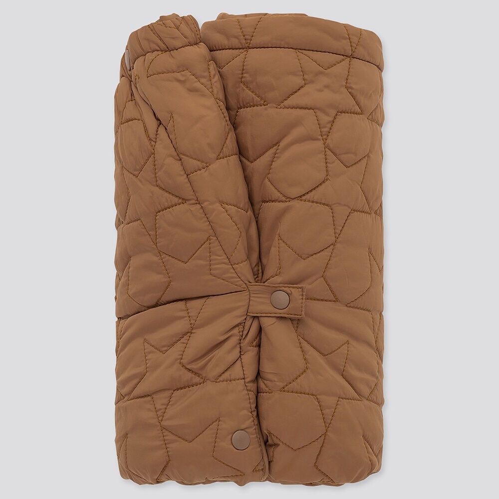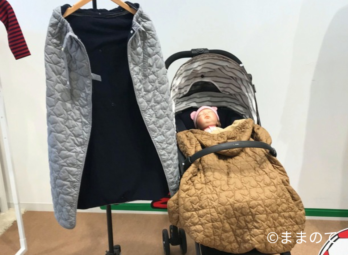 抱っこ紐ケープとベビーカー用と2WAYで使えるブランケット。表面はスター柄キルトのナイロン、裏面はマイクロフリース素材のため、軽くてやわらか、そしてあたたかいですよ。お客様の声をもとに、足元のスナップボタンを外れにくくした点が今季のアップデートポイントとか。
