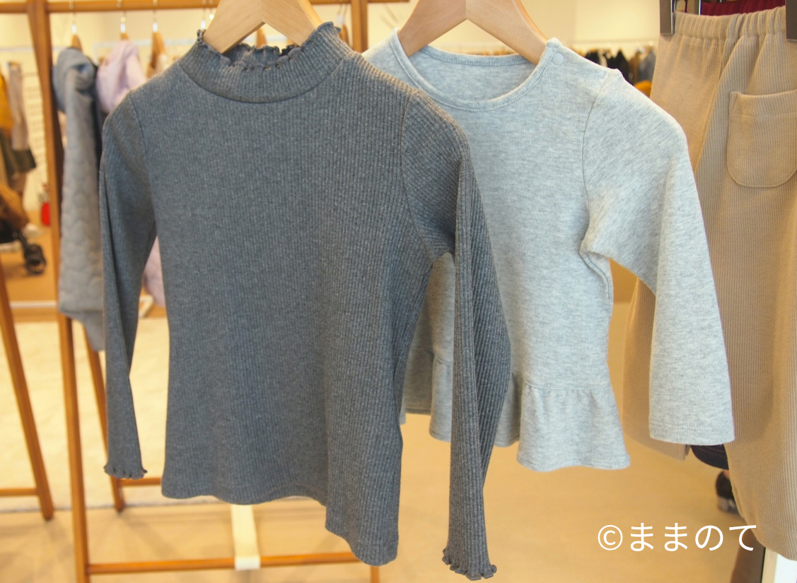 リブフリルハイネックT(990円/サイズ110~160センチ ※160センチはオンラインストア限定サイズ)、クルーネックT(ペプラム)(790円/サイズ70~110センチ ※70センチ・110センチはオンラインストア限定サイズ)