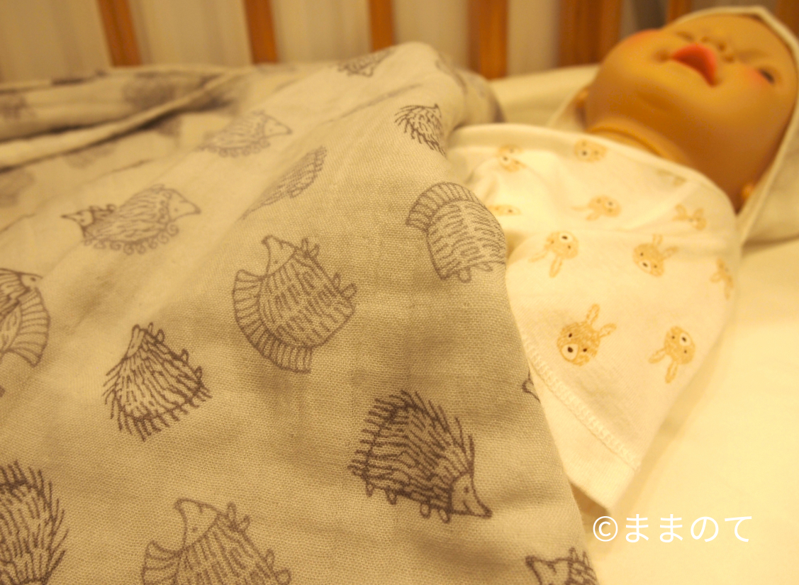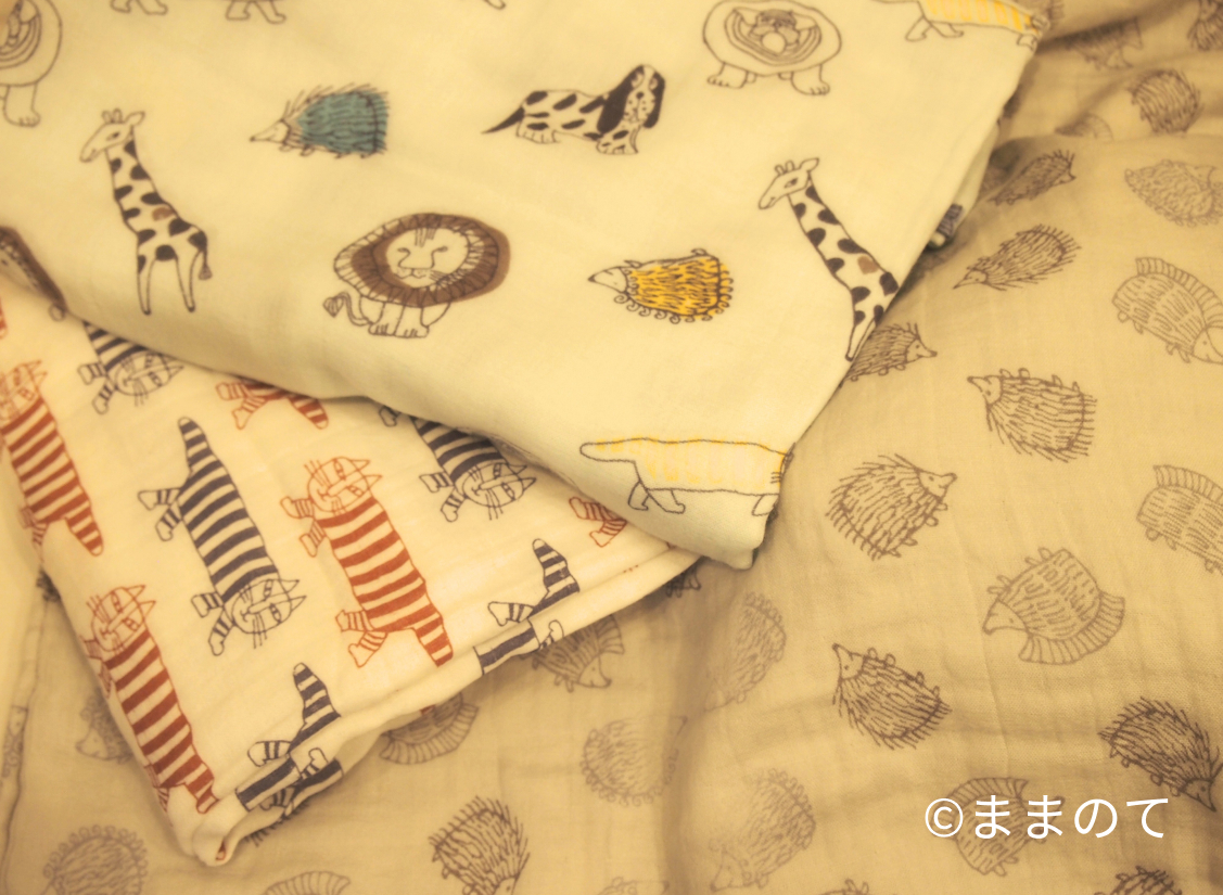 おくるみ(※オンラインストア限定)は肌着と同柄。綿100%のガーゼ製でやわらかな手触りですよ。