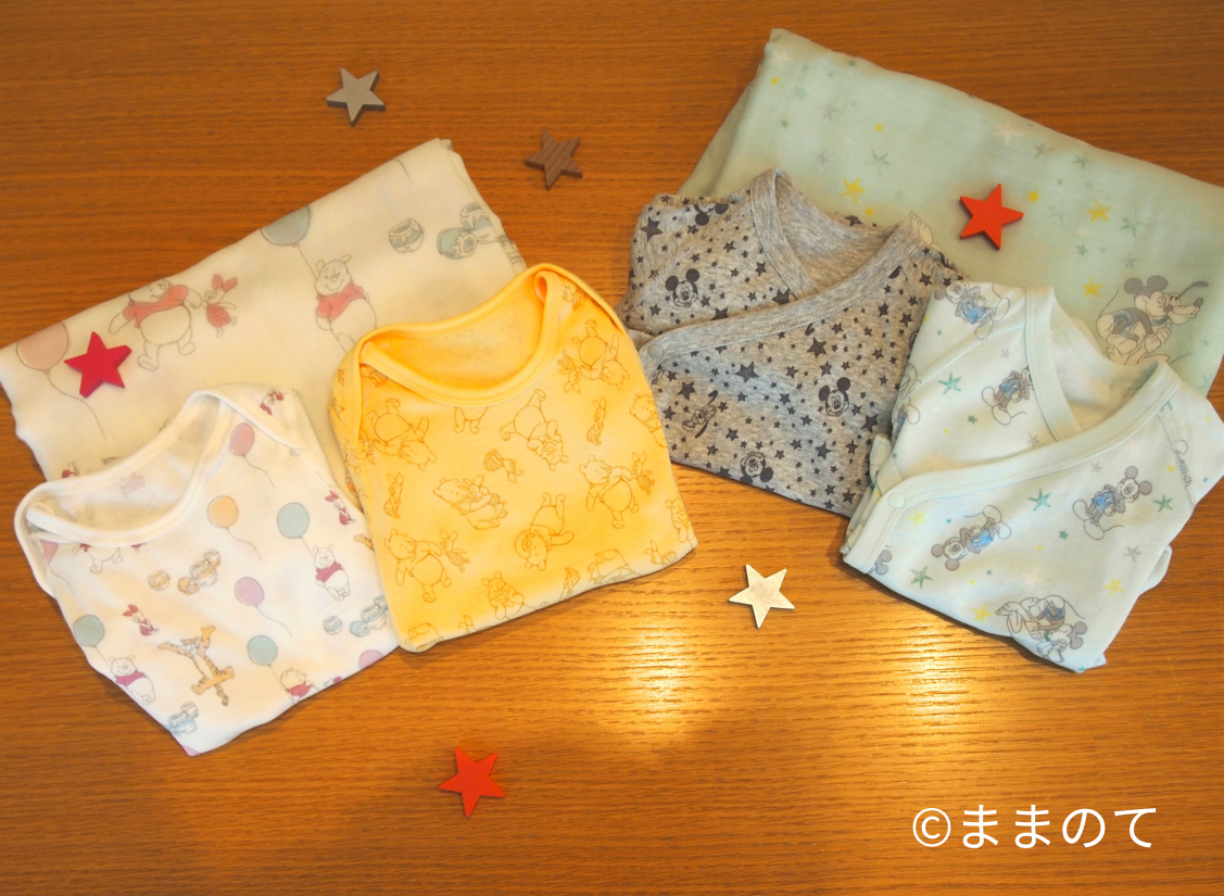 左・ディズニー コレクションクルーネックボディ(長袖・2枚組)(990円/サイズ60~90センチ)、ディズニー コレクション おくるみ(1,990円/120×120センチ)