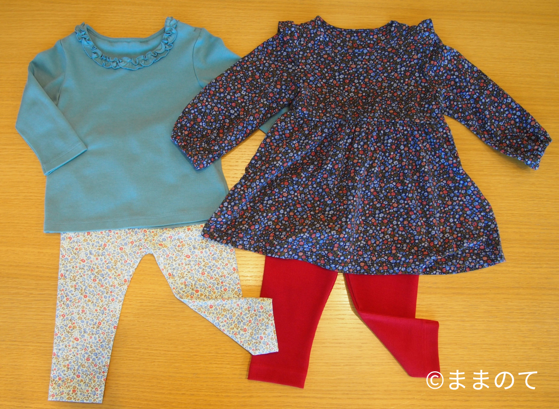 左のレギンスと右のワンピースは同柄の色違い。シックで上品な小花柄はおでかけにもぴったりですね。ワンピースは肩にあしわられたフリルがキュートです。