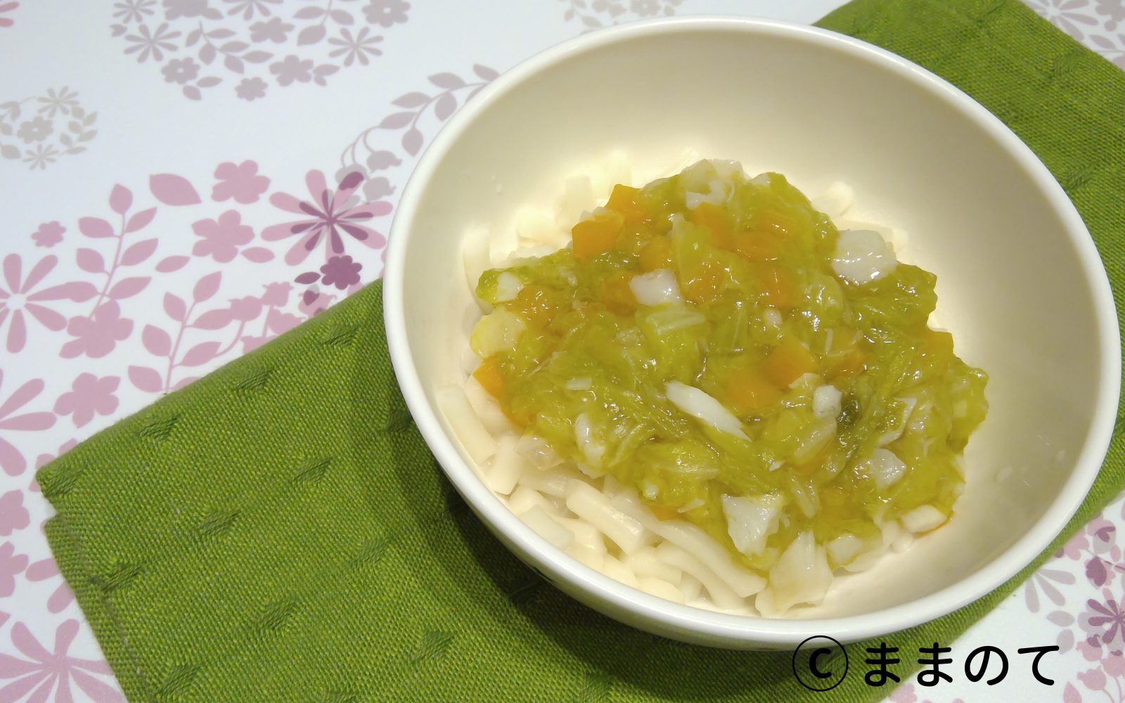 | 離乳食中期(モグモグ期) (7ヶ月・8ヶ月) | 舌ですりつぶせる程度のかたさが目安。加熱後に細かくほぐし、あらくすりつぶす。食べにくいようならとろみをつける。 |
