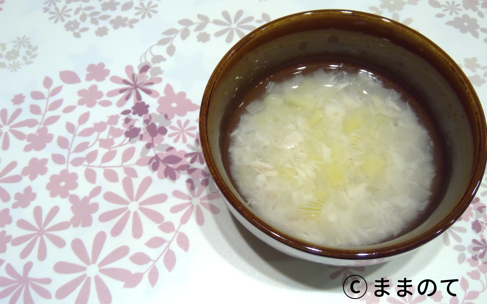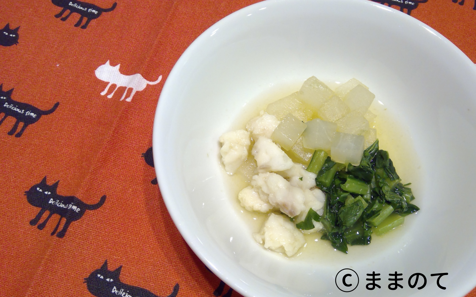 3.白身魚と残りの野菜スープを耐熱容器に入れ、ふんわりとラップをして電子レンジで30秒加熱する