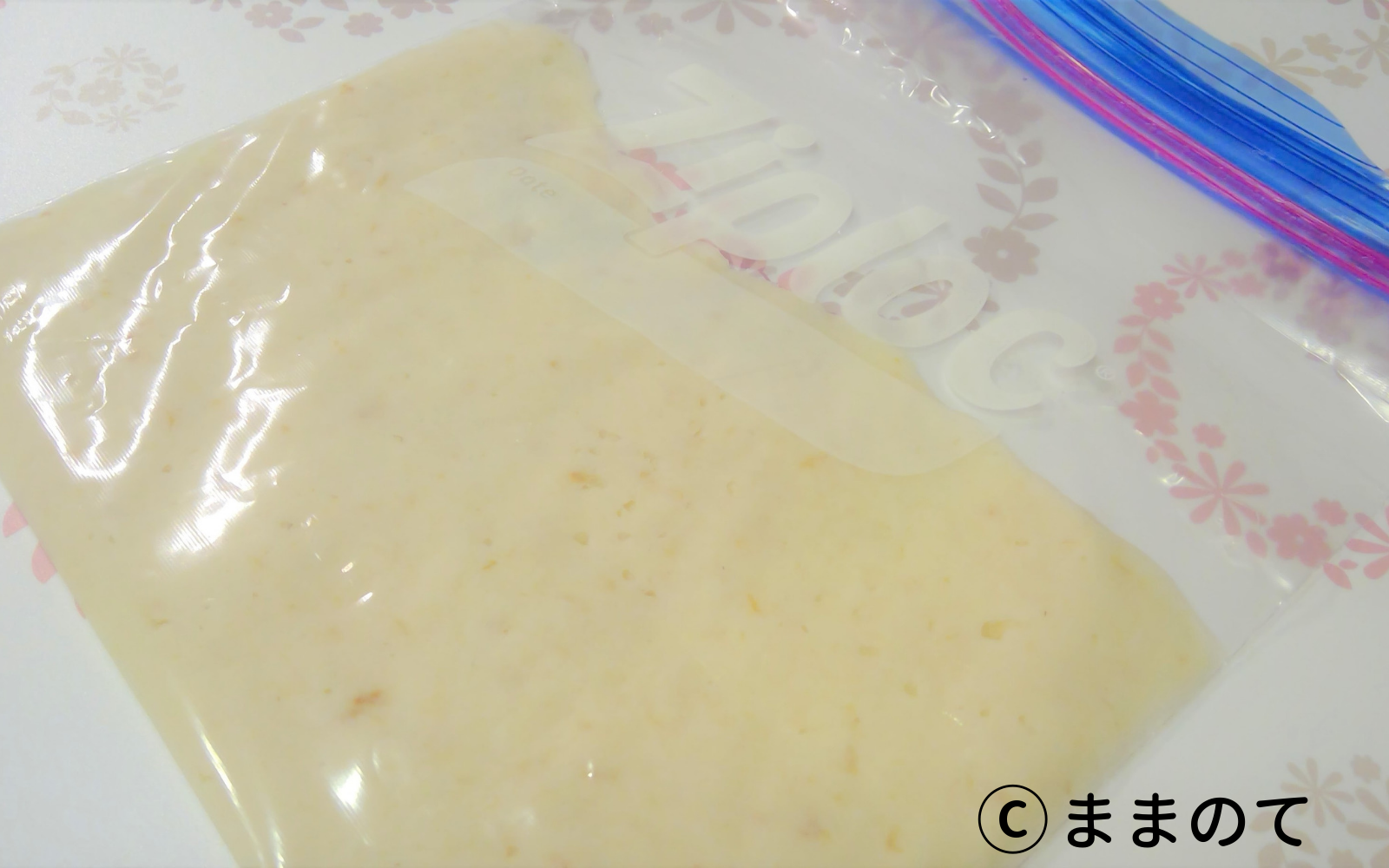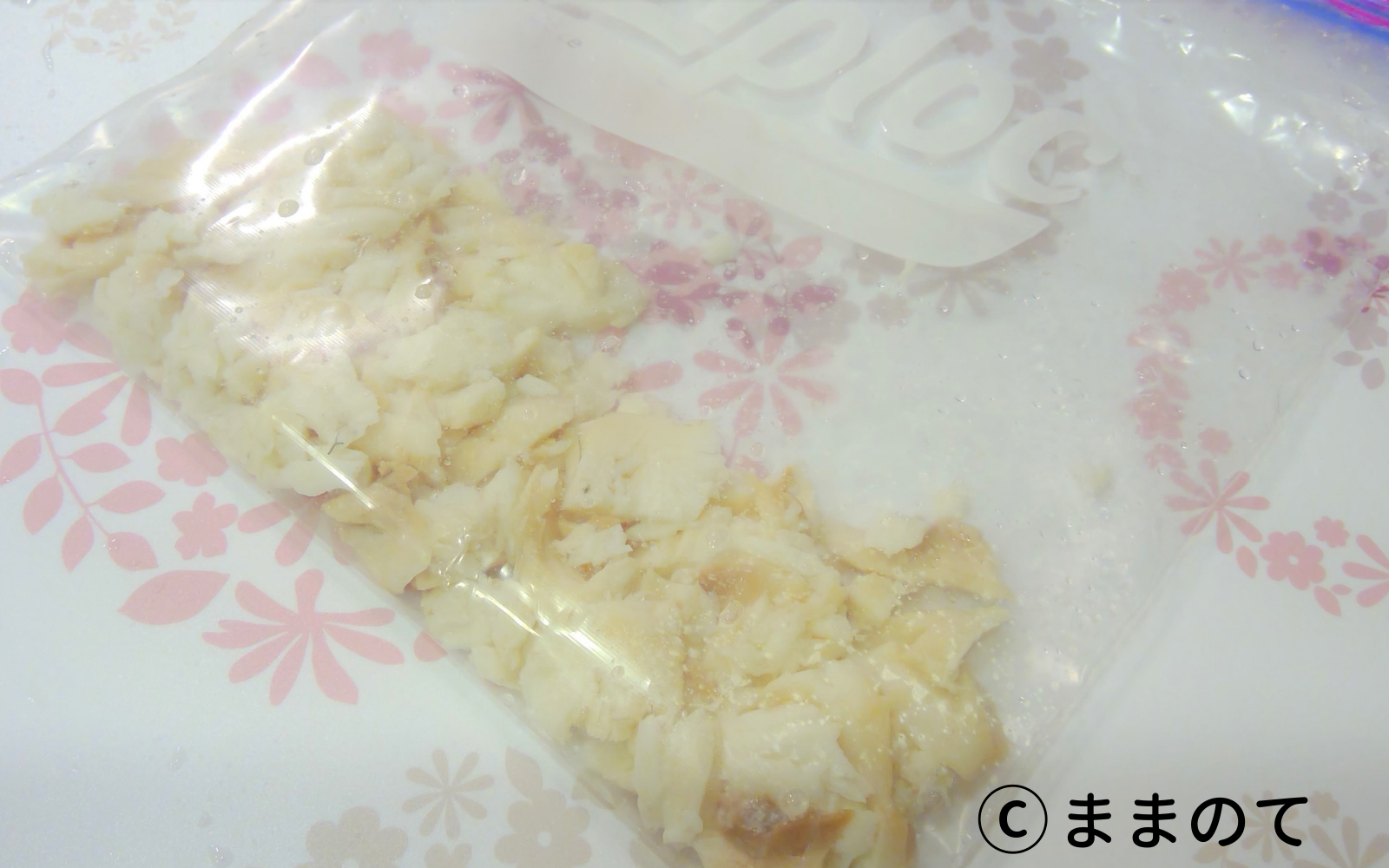 ペーストやピューレにした白身魚をフリーザーバッグに入れて保存する場合は、菜箸などで筋を入れておくと使いやすいでしょう。菜箸で筋がつけづらい場合は、半冷凍の状態で筋を入れてみてくださいね。また、薄く伸ばして冷凍しておくと必要な分だけ折って使うことができます。
