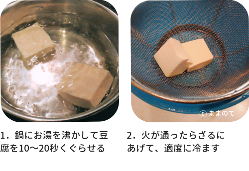 1.お湯を沸かした鍋に豆腐を10~20秒間くぐらせる