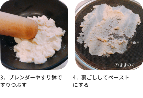 3.1と2をザルにあげ、豆腐とバナナをすりつぶすか裏ごしして混ぜたら完成