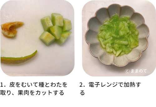 2.1の果肉をそれぞれみじん切りにして電子レンジで30秒加熱する。