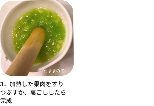 | 後期 (9~11ヶ月頃) 〇 | 少し粒が残るくらいのかたさ。果肉は細かく刻む。 |
