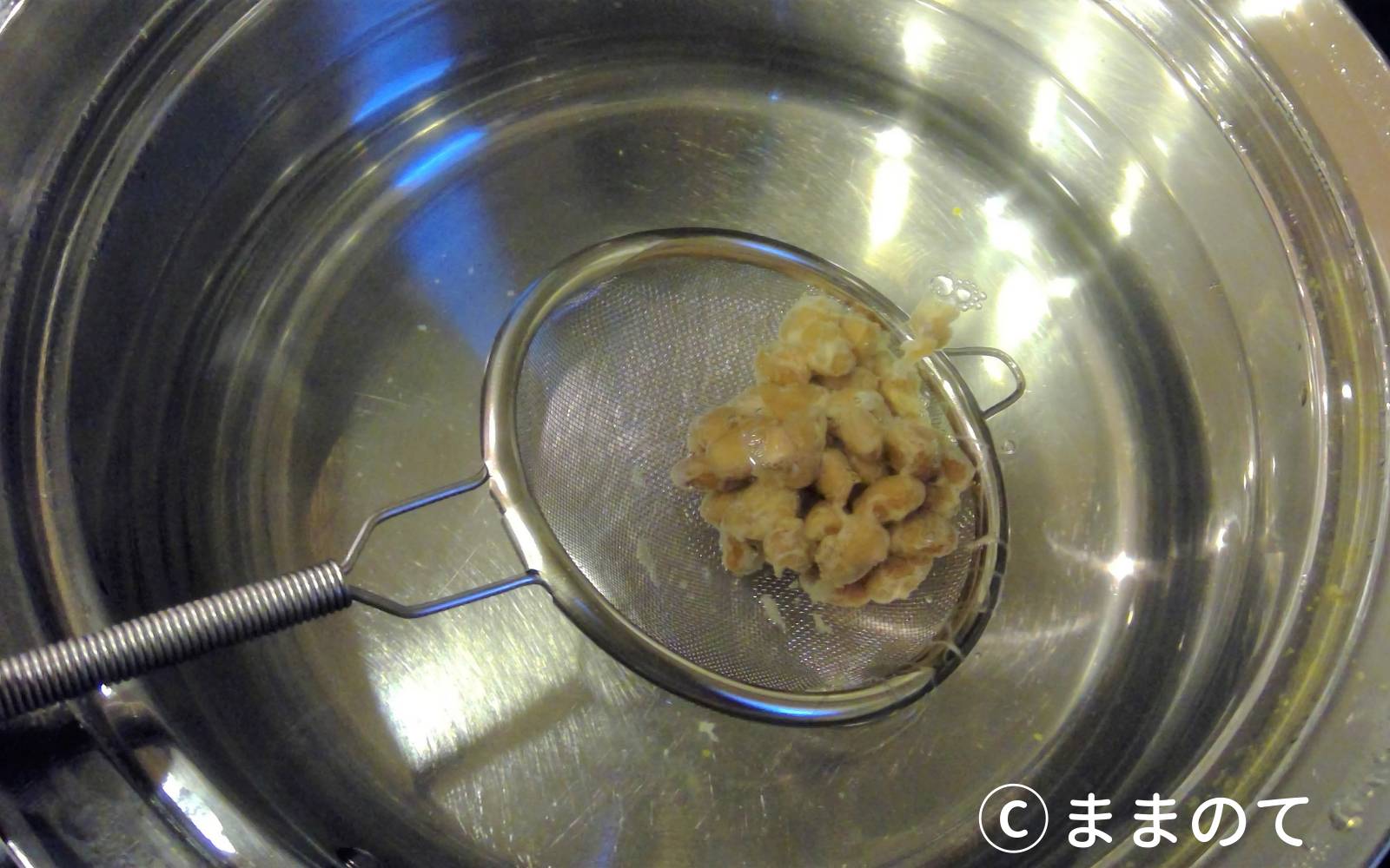 1.少量の納豆をざるや茶ごしに入れて湯通しする