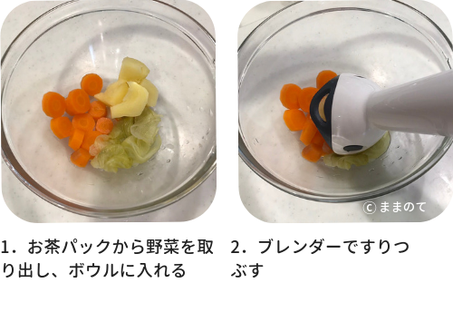 1.お茶パックから野菜を取り出し、ボウルに入れる。
