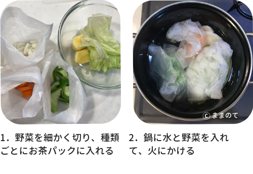 1.すべての野菜を細かく切り、種類ごとにお茶パックに入れる。