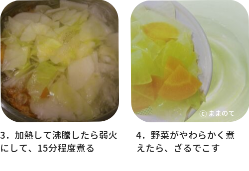 4.煮干しだしを加え、野菜がやわらかくなるまで煮る