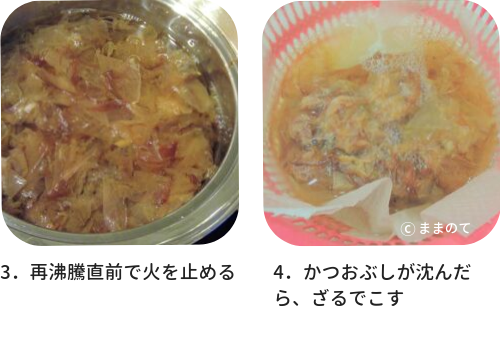 だしをこすとき、かつお節を絞りたくなるかもしれませんが、えぐみの原因となるので絞らないように気をつけましょう。こんぶとかつおの合わせだしを作りたい場合は、工程1の前に水にこんぶを30分以上浸しておき、沸騰直前にこんぶをとりだしましょう。それから再加熱し、工程2へ進みます。