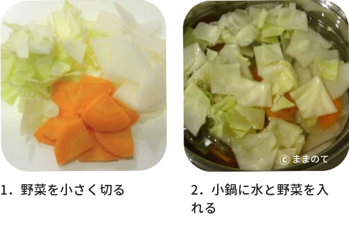 2.水と野菜を小鍋に入れる