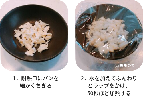 2.食パンを小さくちぎって耐熱皿に入れ、水を加えて浸す