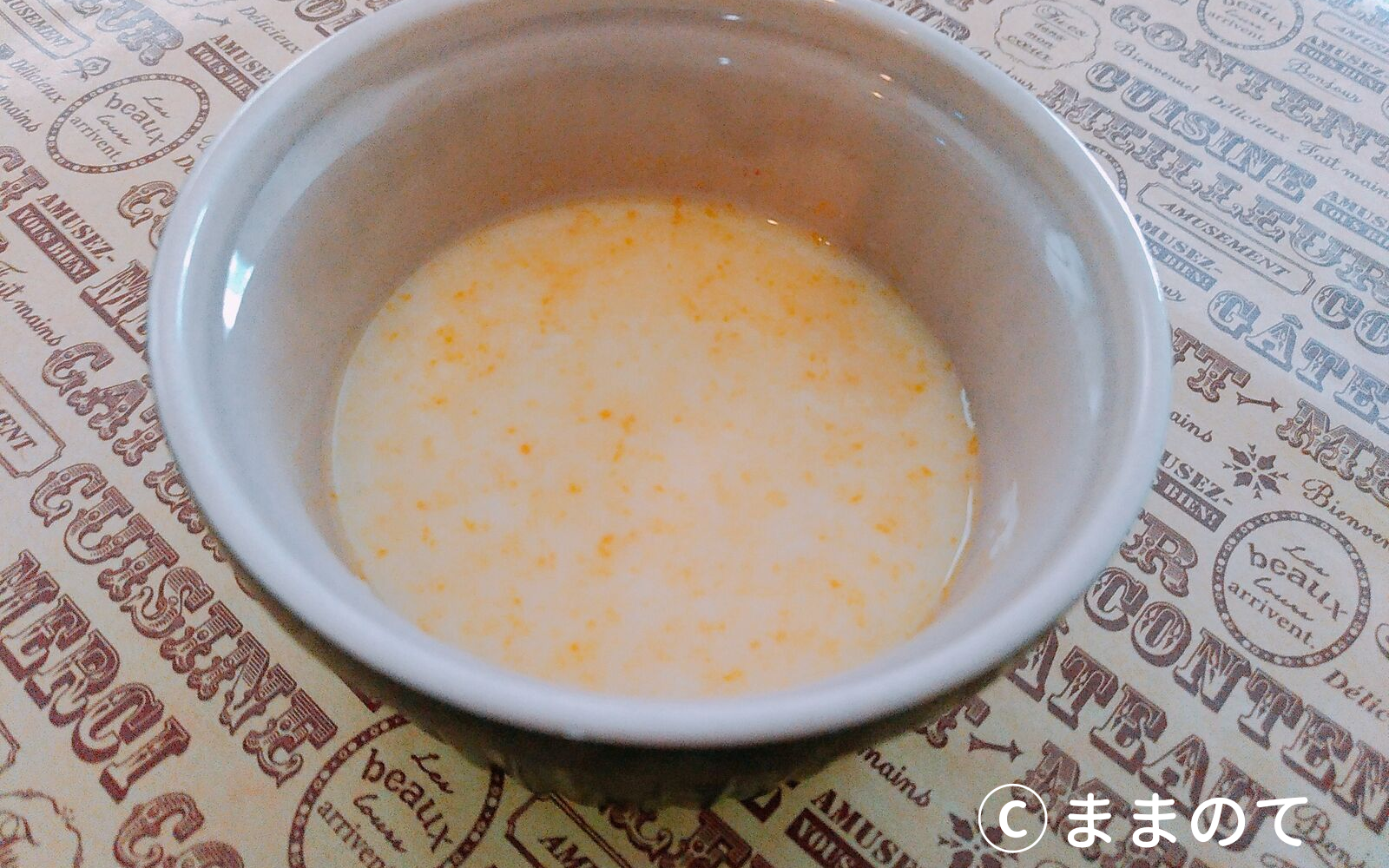 2.食パンを小さくちぎって耐熱皿に入れ、1のにんじんと溶いた粉ミルクを加える