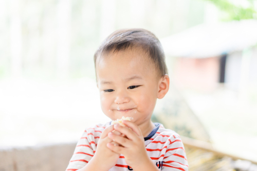 離乳食後期(カミカミ期)は、徐々に手づかみ食べに移行していくと良いでしょう。ただし、初めのうちは、赤ちゃんが手づかみで食べやすいよう、小さめサイズにちぎってあげてください。