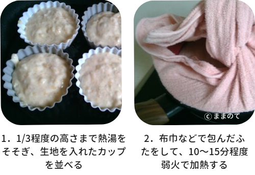 1.カップの1/3程度の高さまでフライパンに熱湯をそそぎ、生地を入れたカップを並べる