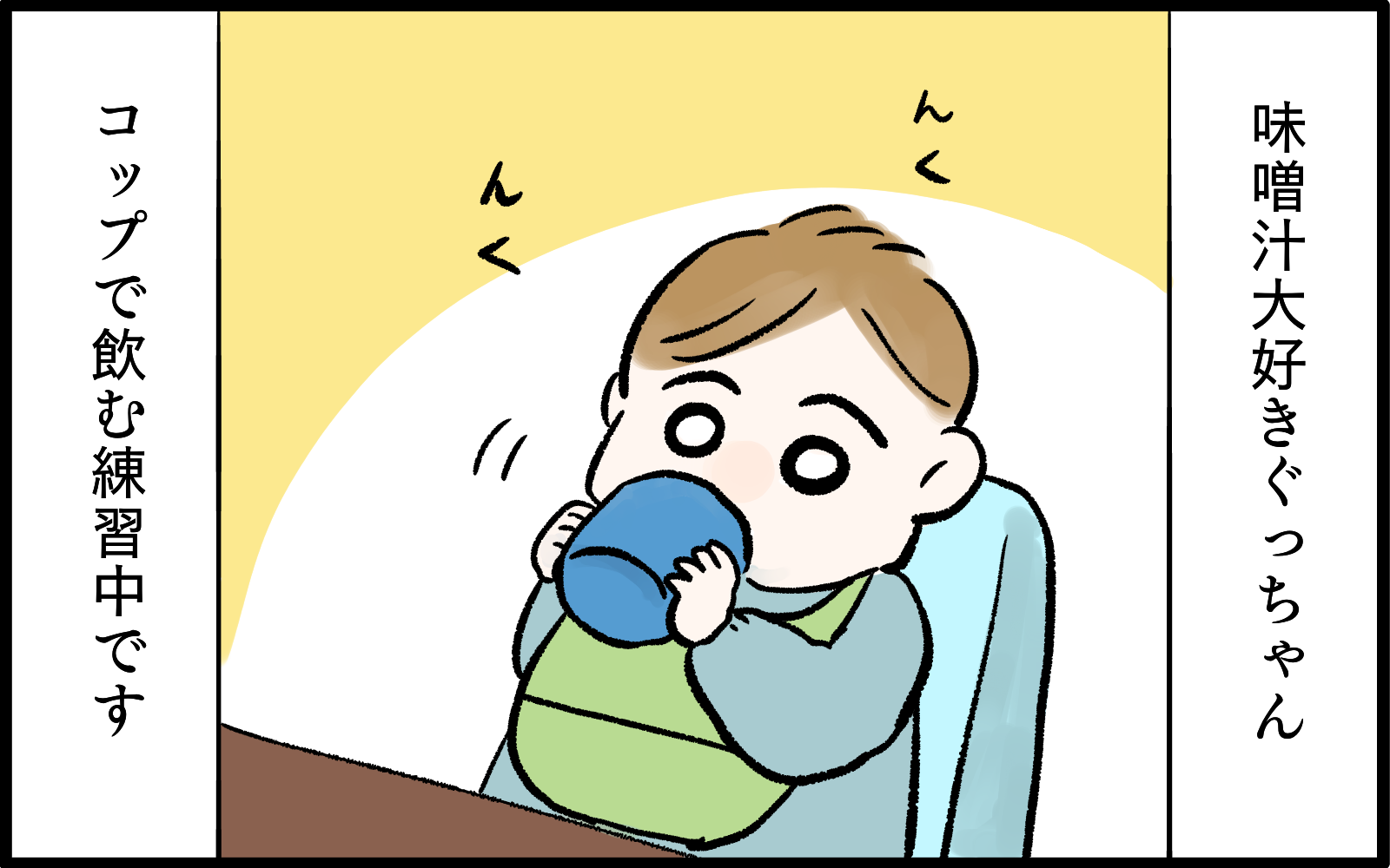 Instagramで大人気のchiikoさんの育児マンガ!お味噌汁大好きな息子・ぐっちゃん。「上手にコップで飲めた!」かと思いきや…?