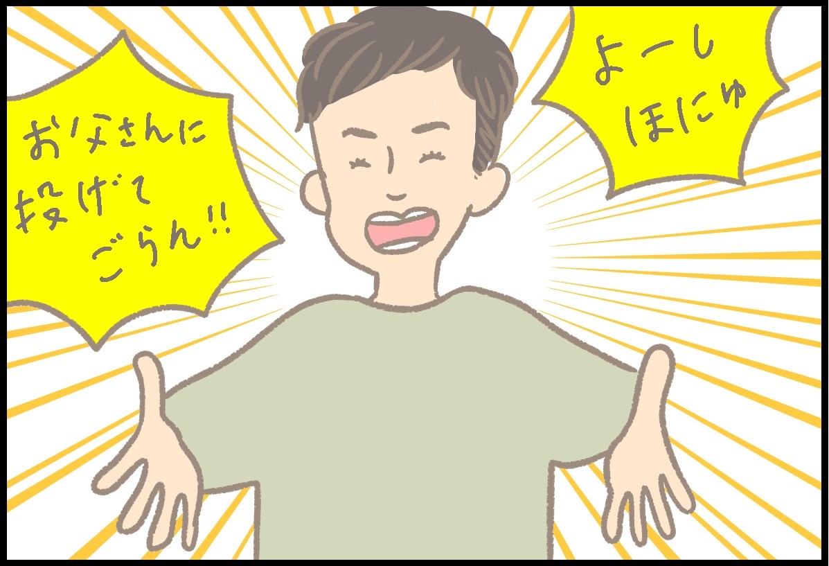 いよいよ、ボールを投げることができるようになったほにゅくん。パパと遊ぶときは容赦がありません。わざわざパパに近づいて思い切り投げるという知恵に、思わず笑いがこみあげてきますね。「お父さんに投げてごらんん!」とほにゅくんとコミュニケーションをとろうとする、パパのやさしさも伝わってくる作品です。(編集部)