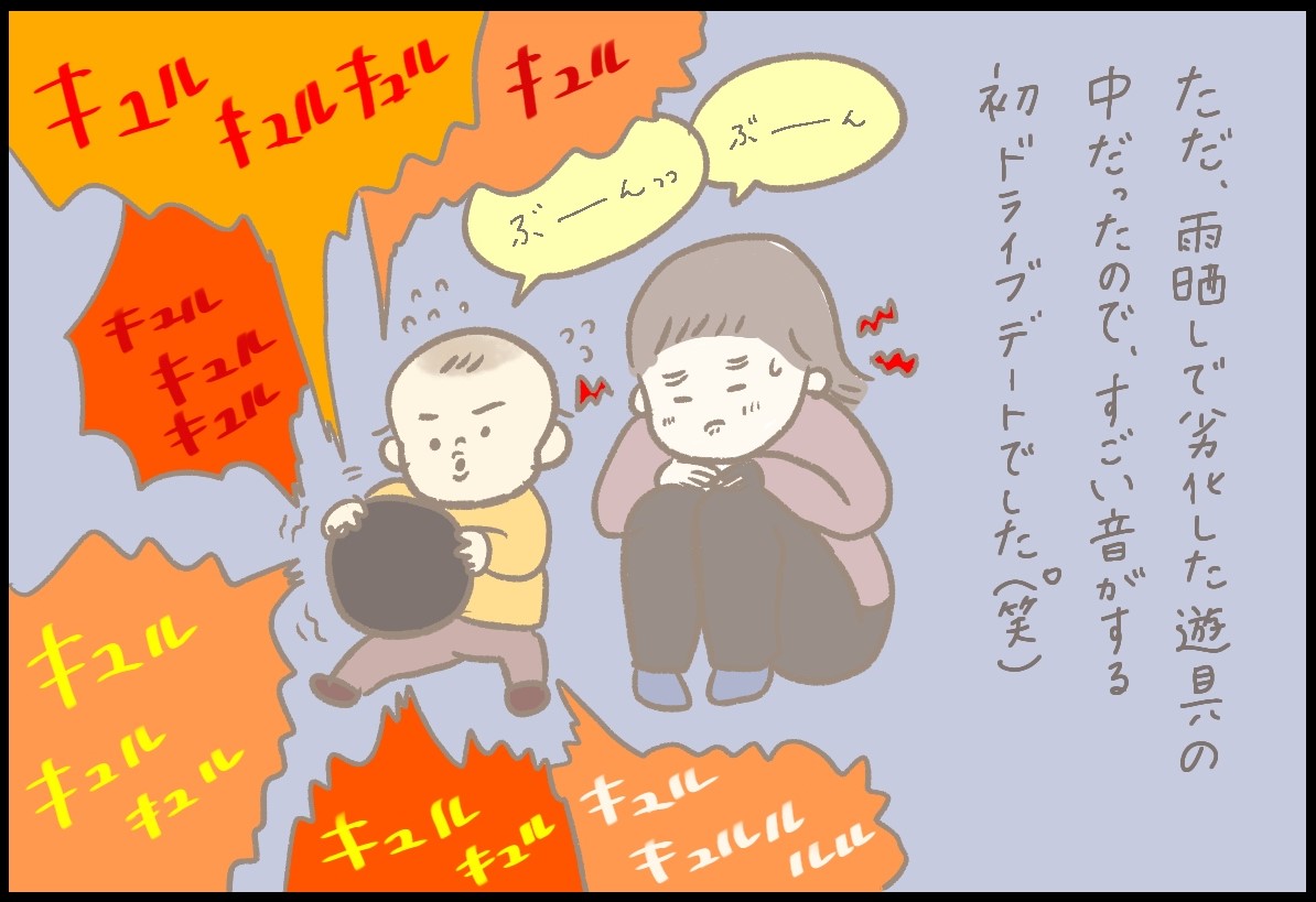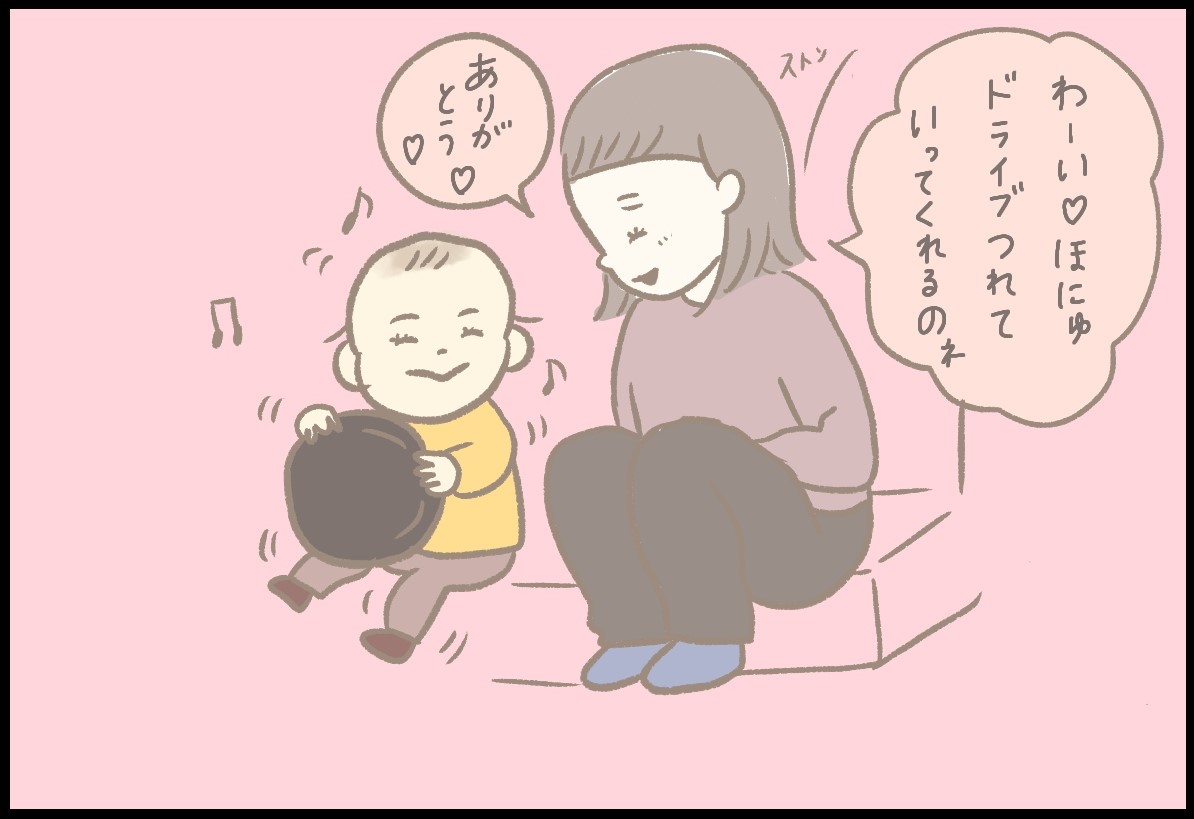 息子からのドライブのお誘い、うれしいですね。運転に夢中になっているほにゅくんの得意げな顔が、とてもかわいらしいです。キュルキュルとすごい音がする中、ドライブデートに付き合うつぶみさんの優しさも伝わってきました。