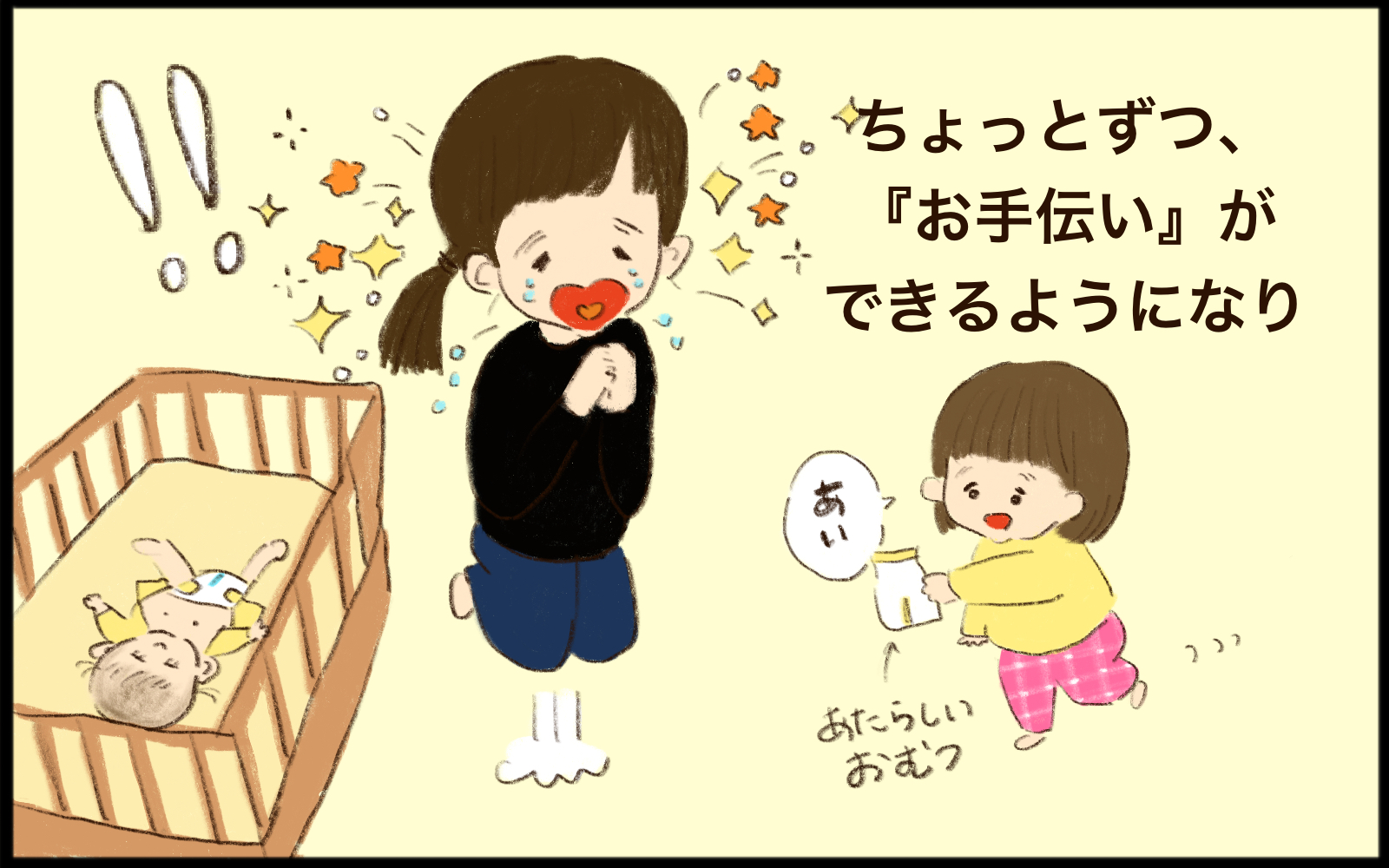 おむつをもって来てくれたり、捨てにいってくれたりたくさんお手伝いをしてくれるようになりました。そのたびに私は、ほめちぎりました。