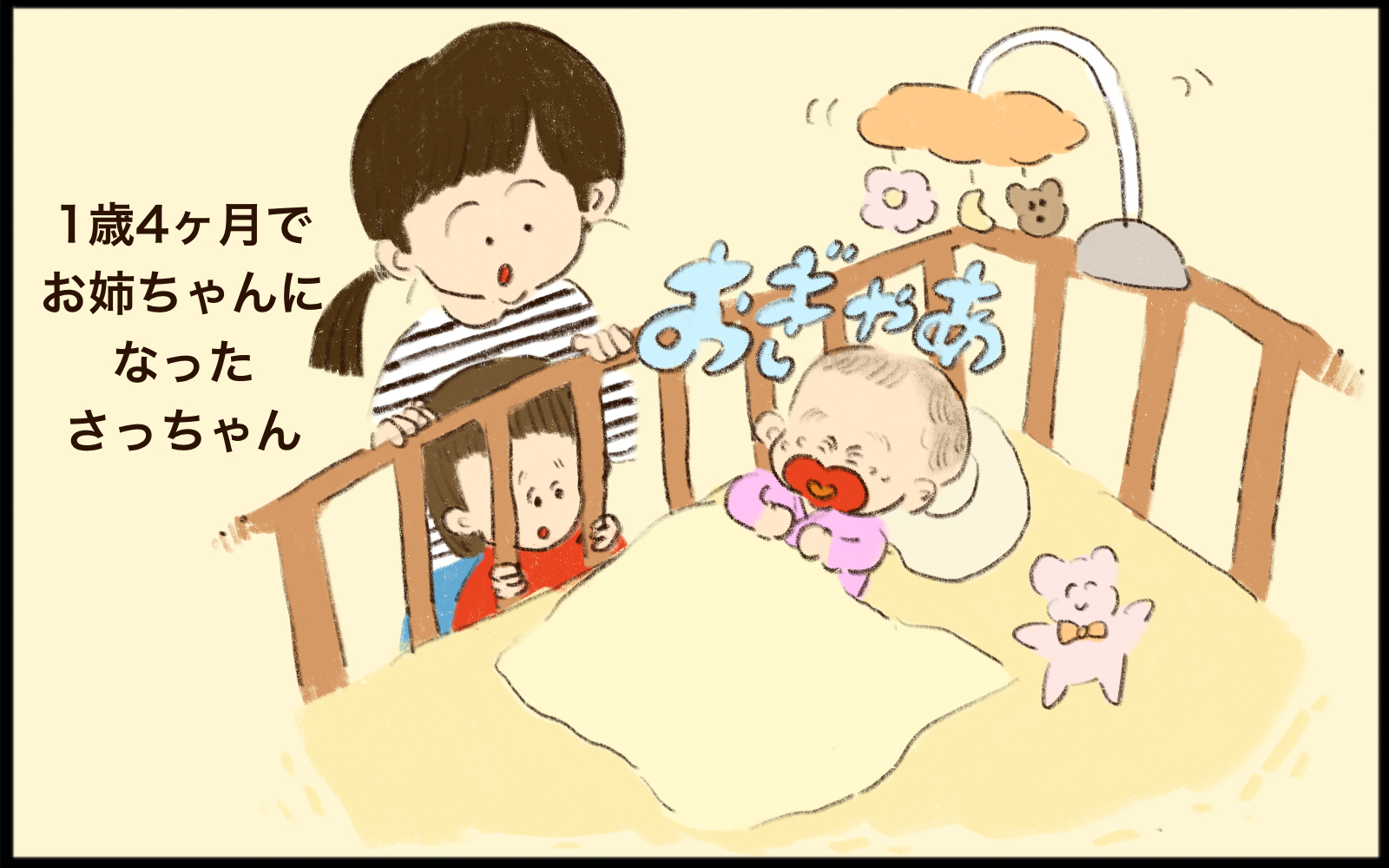 年子育児の日常を描くエッセイマンガ!おおもりなつみさんが描く、あたたかくてかわいいイラストとコラムをお届けします。生まれてすぐお姉ちゃんになったさっちゃんは、ママを妹にとられないか不安でいっぱい…。そんなさっちゃんのお姉ちゃんとして成長していく姿をご紹介します。