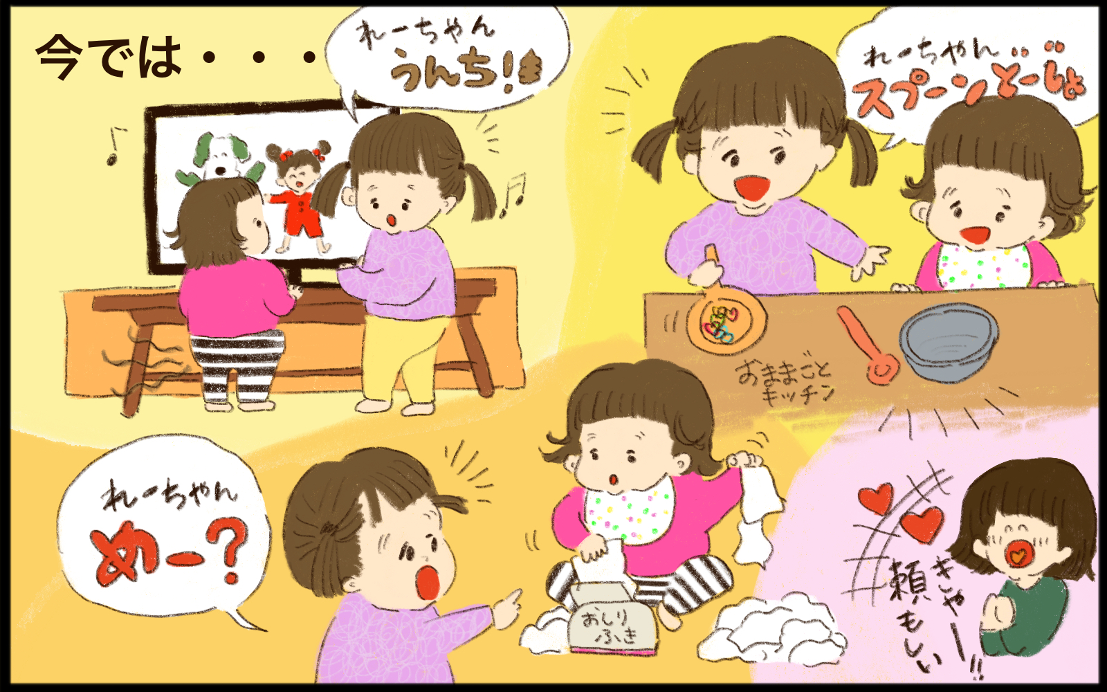「れーちゃんかわいいねぇ」「れーちゃんよしよし」「れーちゃんうんち?」「れーちゃんおもちゃどーじょ」などの声をかけ、毎日の暮らしの中でさっちゃんは妹を気遣ってくれる頼もしい「お姉ちゃん」になっていきました。