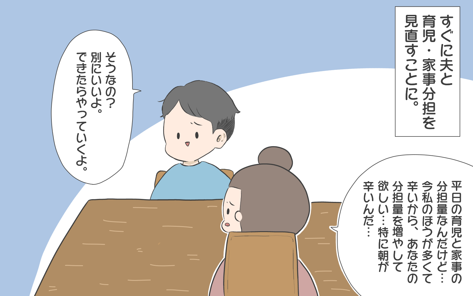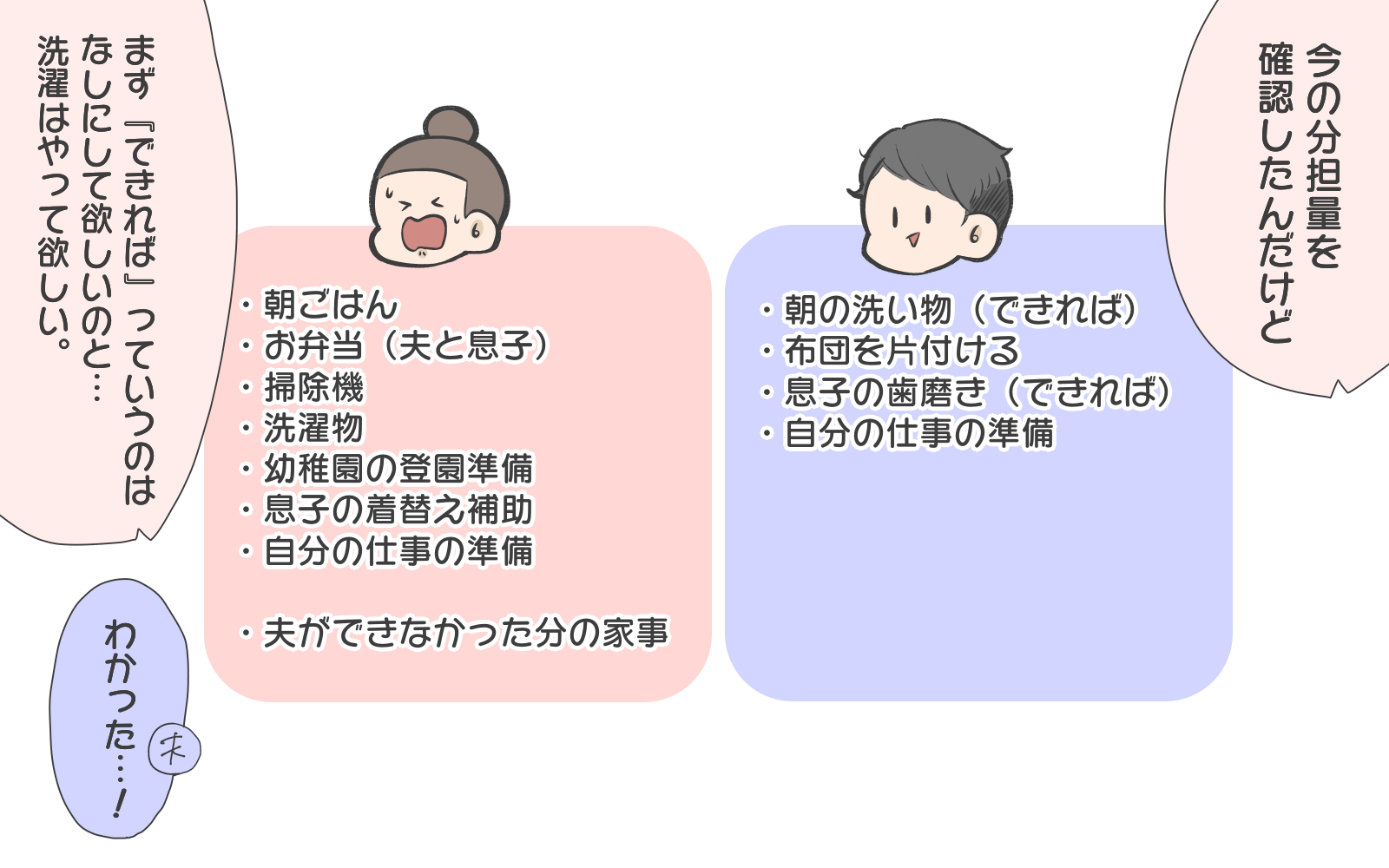 育児マンガ家おかめ(@omame_okame)さんが描く!ワーキングマザーの日常の出来事や奮闘をマンガでお届けします。仕事を始めて大忙しのおかめさんは夫と家事・育児の分担を見直すことにしましたが、夫の態度はというと…?